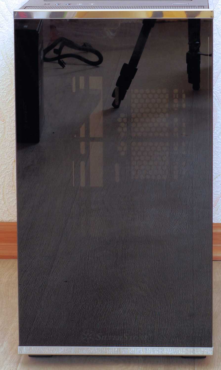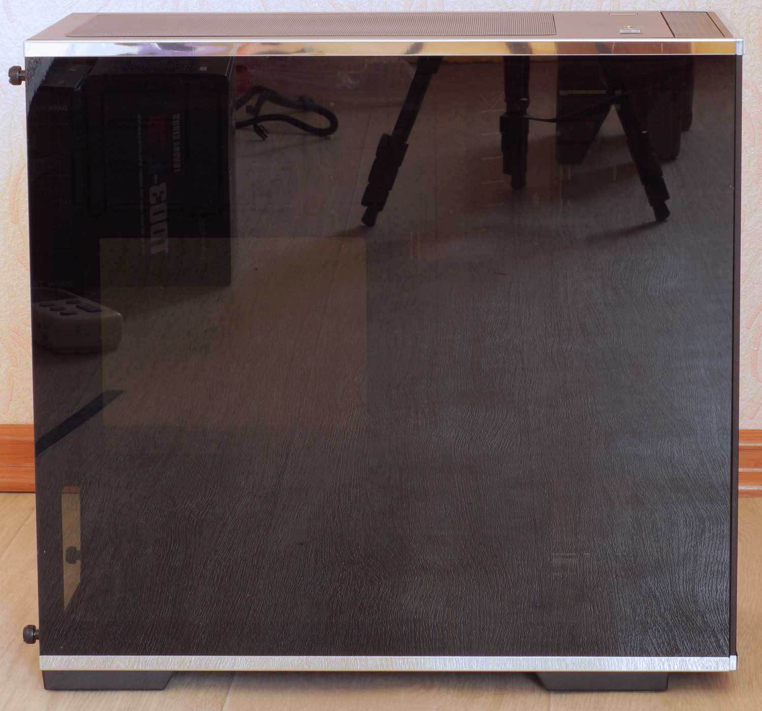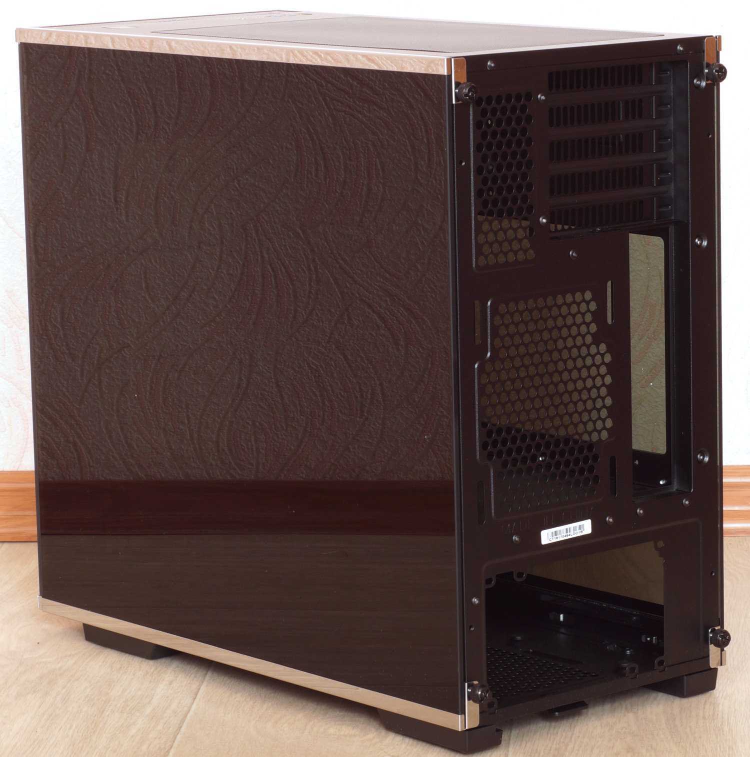 Как уже отмечали, лицевая сторона выполнена полностью из тонированного закаленного стека, делая из него хорошее зеркало. Отсутствие вентиляции спереди позволяет надеяться, что корпус будет тихим (при использовании соответствующих вентиляторов), а с другой стороны, возникают некоторые опасения на счет эффективности охлаждения. Особая конструкция корпуса хорошо заметна по задней стенке, когда материнская плата размещается на левой боковой стенке (относительно лицевой панели). Задняя часть получила максимальную область перфорации и, учитывая ширину корпуса (218 мм), сзади можно установить только один 120 мм вентилятор.