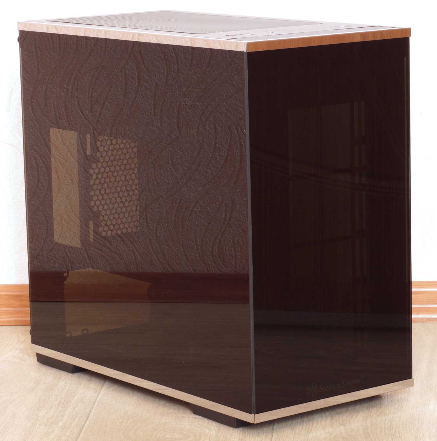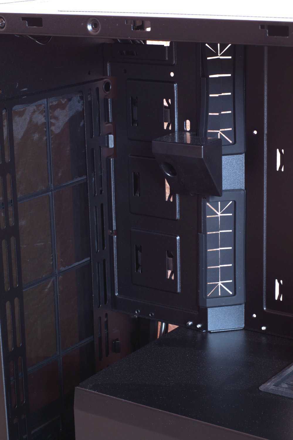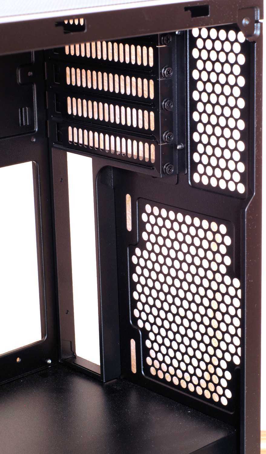 Как уже отмечали, лицевая сторона выполнена полностью из тонированного закаленного стека, делая из него хорошее зеркало. Отсутствие вентиляции спереди позволяет надеяться, что корпус будет тихим (при использовании соответствующих вентиляторов), а с другой стороны, возникают некоторые опасения на счет эффективности охлаждения. Особая конструкция корпуса хорошо заметна по задней стенке, когда материнская плата размещается на левой боковой стенке (относительно лицевой панели). Задняя часть получила максимальную область перфорации и, учитывая ширину корпуса (218 мм), сзади можно установить только один 120 мм вентилятор.