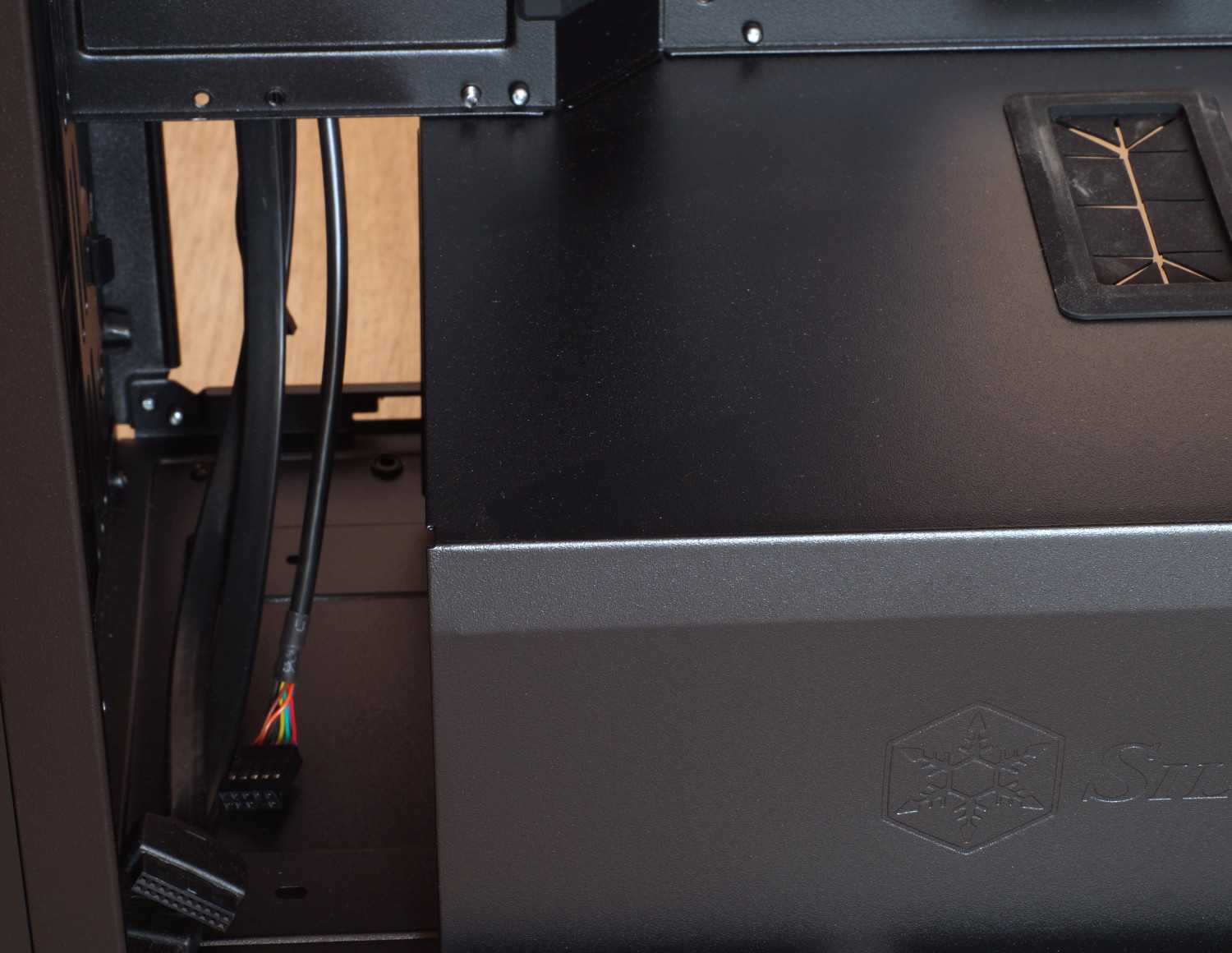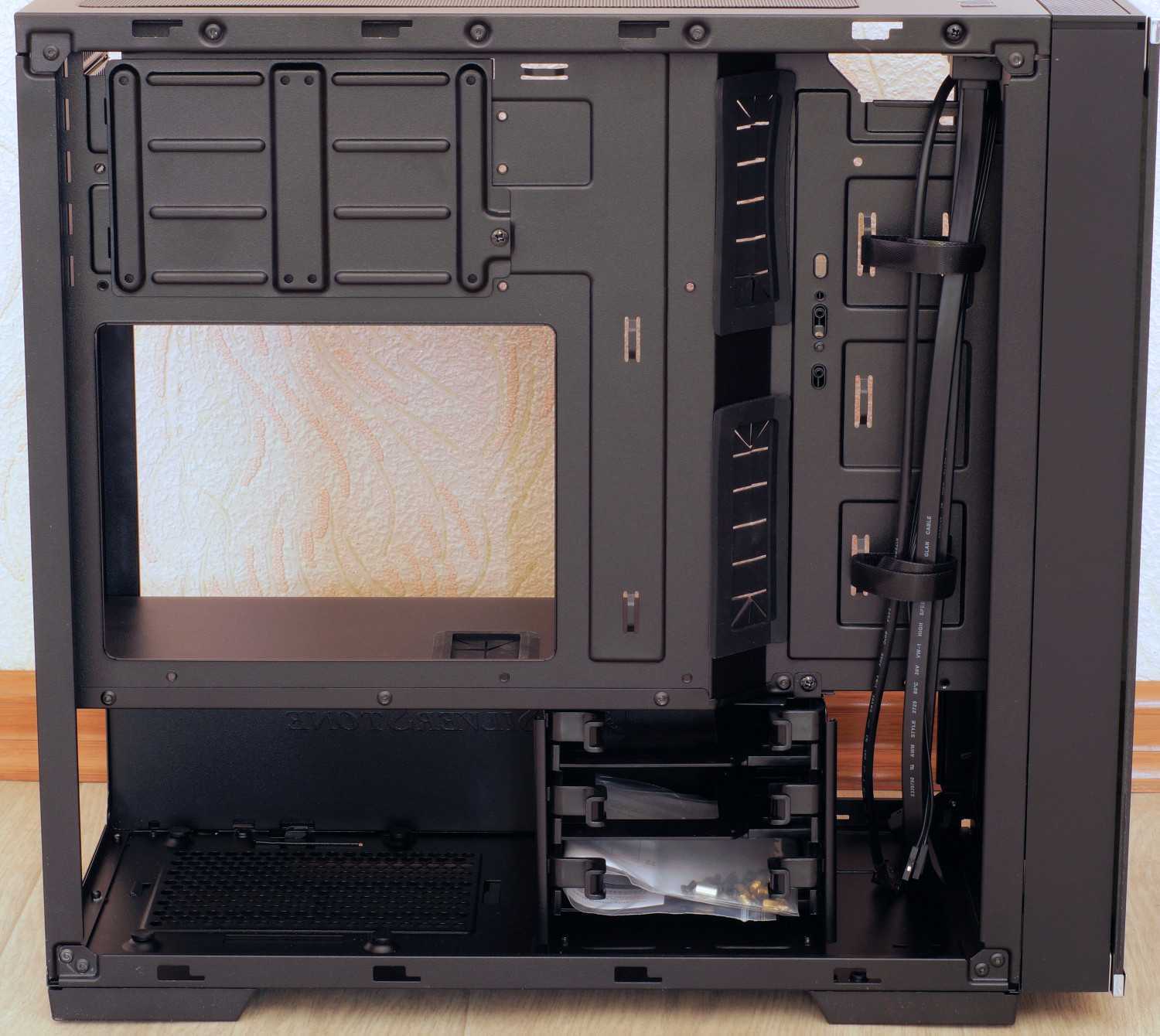 Из особенностей корпуса, связанных с размерами – есть ограничение на максимальную глубину блока питания 160 мм при использовании корзины под накопители в штатном положении; если ее снять или передвинуть, то ограничение вырастает до 220 мм.