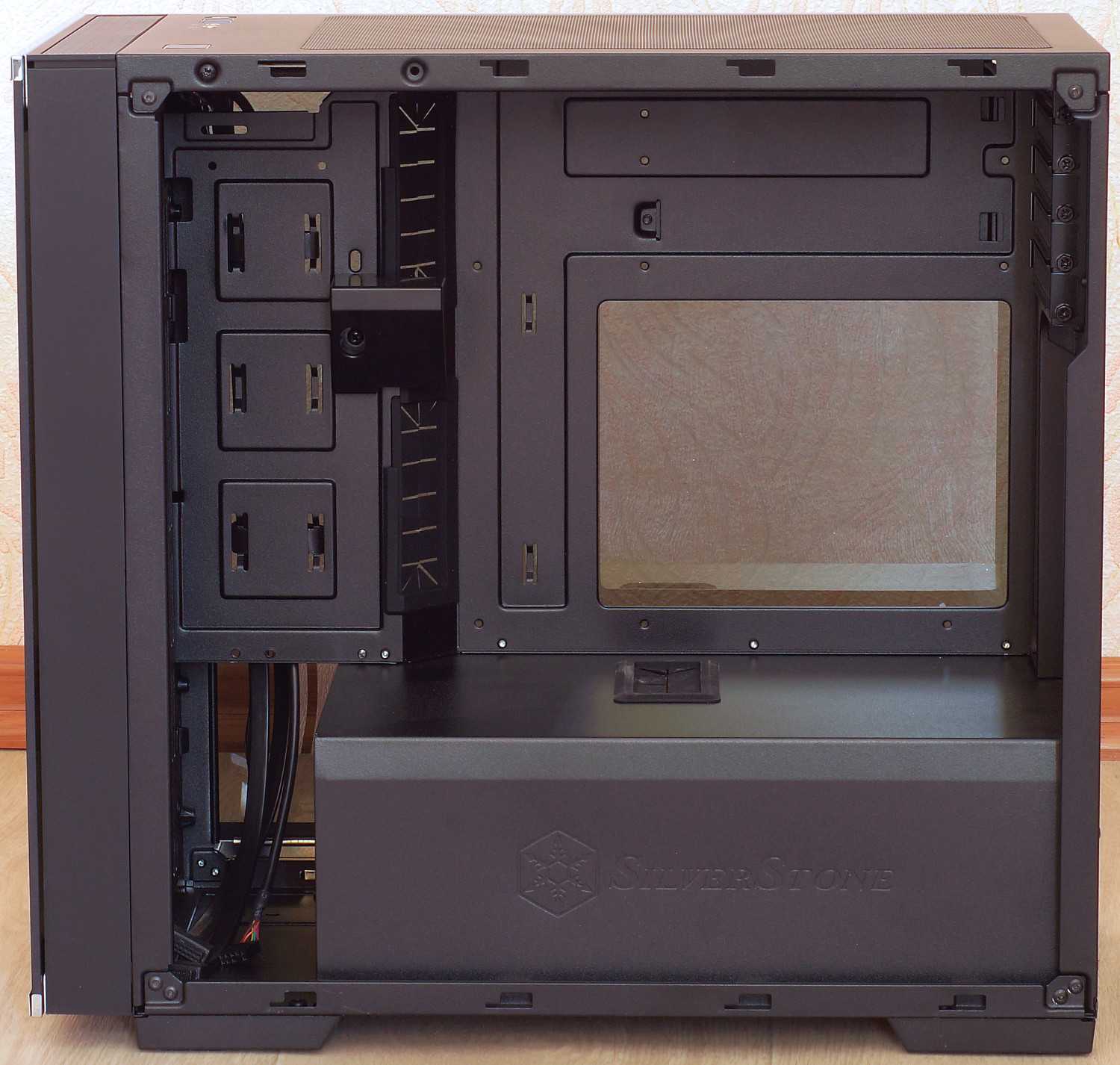 Если говорить о внутреннем строении, то стоит отметить, что при компактных размерах внутреннее пространство Mid-Tower корпуса SilverStone LD01 получило максимальный свободный объем с возможностью установки длинных видеокарт (до 370 мм), кулеров высотой до 168 мм. И, конечно же, корпус выделяется инверсным размещением материнской платы (с левой стороны), которая может быть в форм-факторе mini-ITX/mini-DTX/mATX. Поддон получил широкое окно для установки, а из последних веяний отметим наличие кожуха, скрывающего место установки блока питания и корзины под накопители.