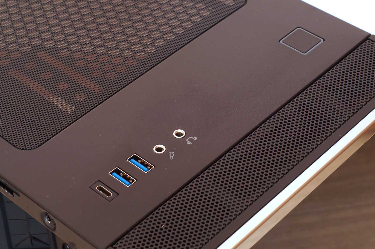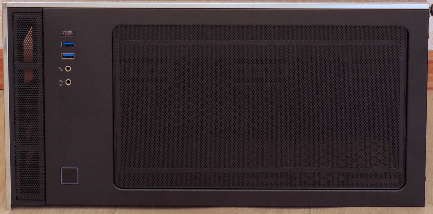 Причем заметно наличие отверстий для вентиляции ближе к лицевой части (приток), где также нашлось место для двух портов USB 3.0 типа А, одного USB 3.1 Gen1 типа C, двух 3.5 мм миниджек разъемов под наушники/микрофон и кнопка питания. В остальной части предусмотрена перфорация для оттока воздуха. Для минимизации проникновения внутрь пылисверхуприсутствует легкосъемная сетка на магнитах.