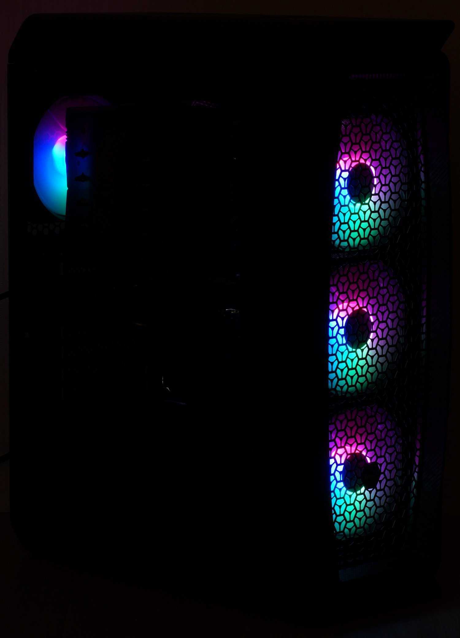 Комплектация Mid-Tower корпуса Aerocool Aero One Frost с боковым окном из закаленного стекла и четырьмя вентиляторами с неизменяемой RGB-подсветкой делает свое дело. Смотрится корпус неплохо, особенно в вечернее время.