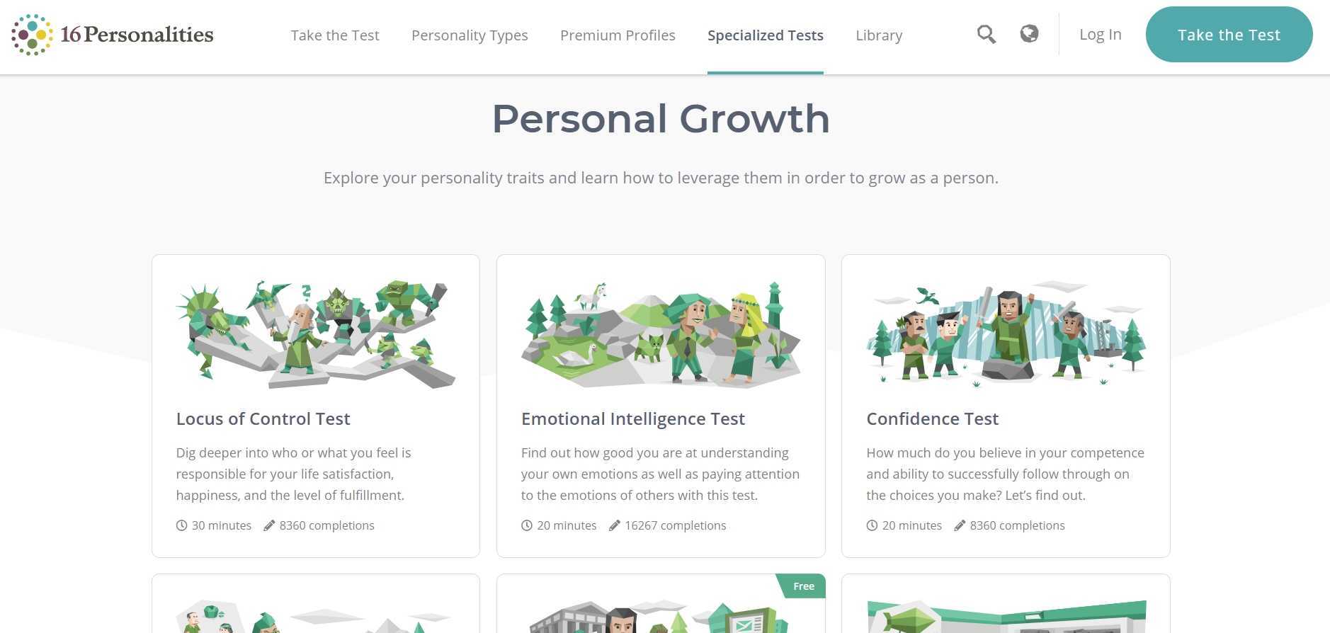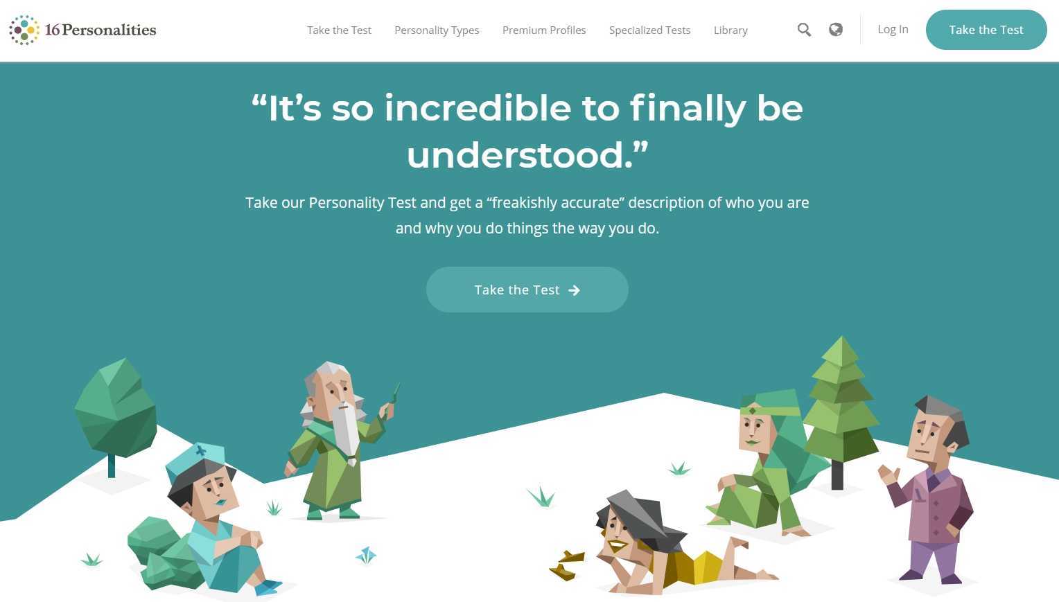 Другой пример — сайт 16Personalities с тестированием личности по методу Майерса Бриггса. У сайта не совсем минималистичный стиль, много персонажей, различных блоков, меню разветвленное, есть много подсказок. Тем не менее, он дает только достаточную для работы на сайте информацию и ничего лишнего.