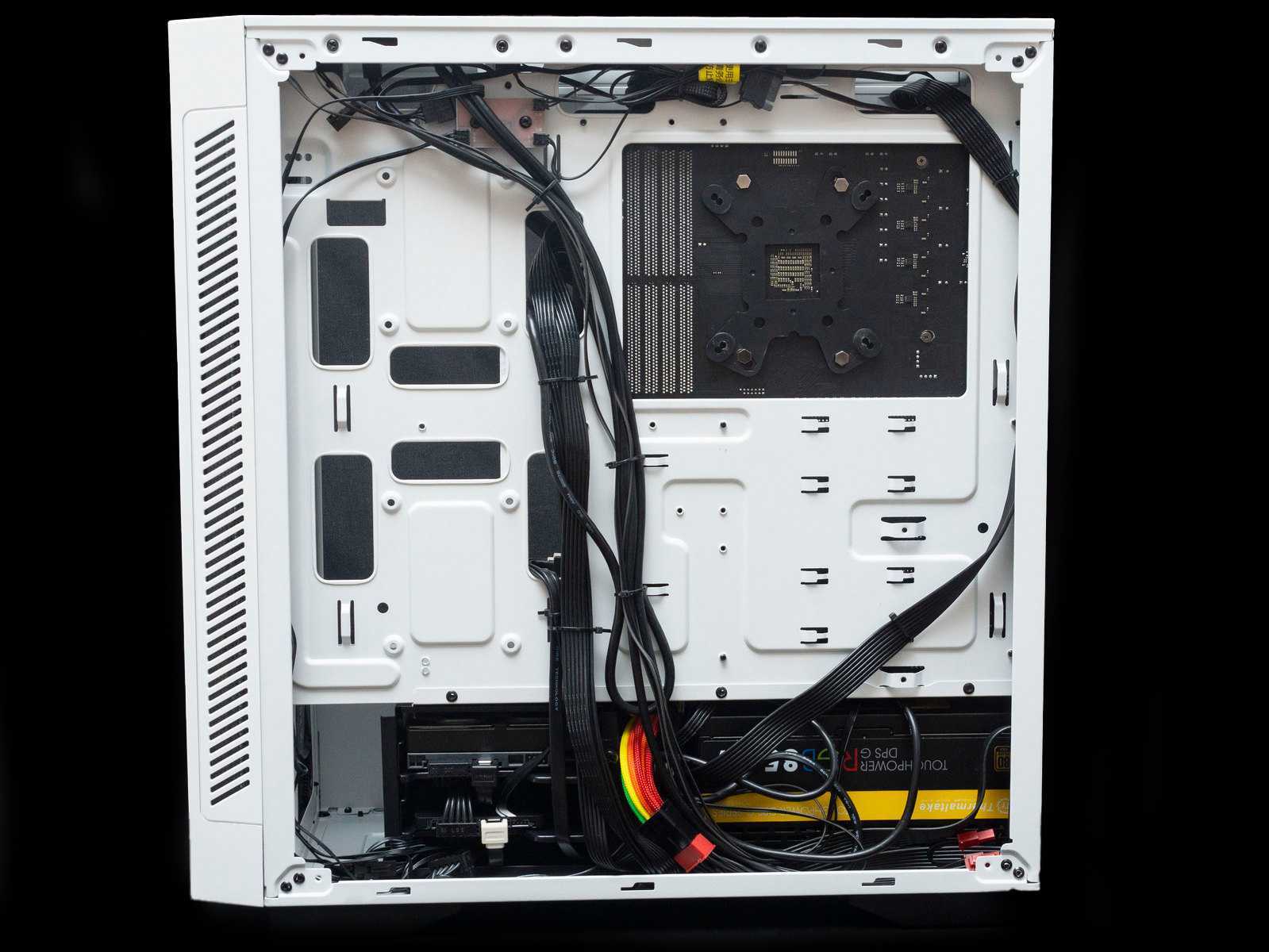 В верхней части предусмотрено достаточно места для радиатора СЖО, также большое пространство за поддоном для укладки кабелей.
