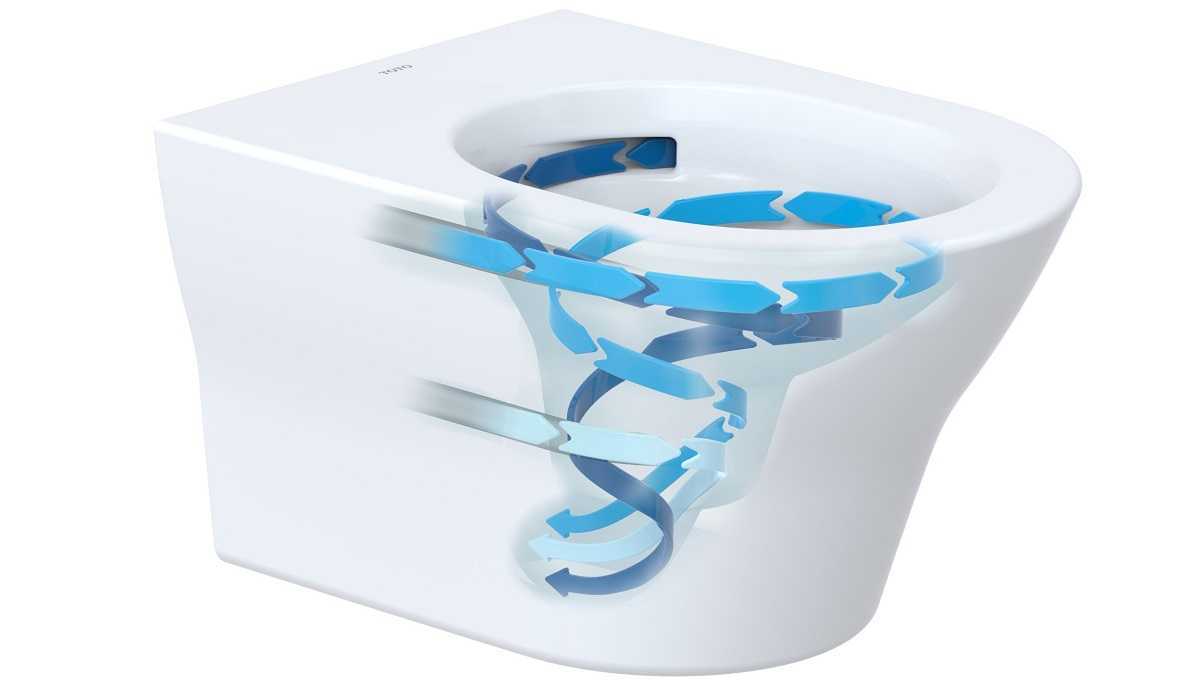 Так, в упоминаемой выше технологии Rimfree используется специальный разделитель потока. Об эффективности подобной системы смыва можно судить по тому факту, что разработки компании Twyford сегодня используют десятки сантехнических компаний. Не менее качественную работу обеспечивает и технология Tornado Flush (торговая марка Toto), особенностью которой является формирование вихревого потока жидкости, вытекающей из трёх отверстий у задней стенки чаши.