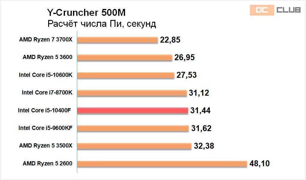Бенчмарк Y-Cruncher – чисто математический тест. Идёт расчёт числа Пи с 500 млн. знаков после запятой, для чего современным процессорам и минуты много. Примечателен великолепным распараллеливанием на любое количество ядер/потоков.