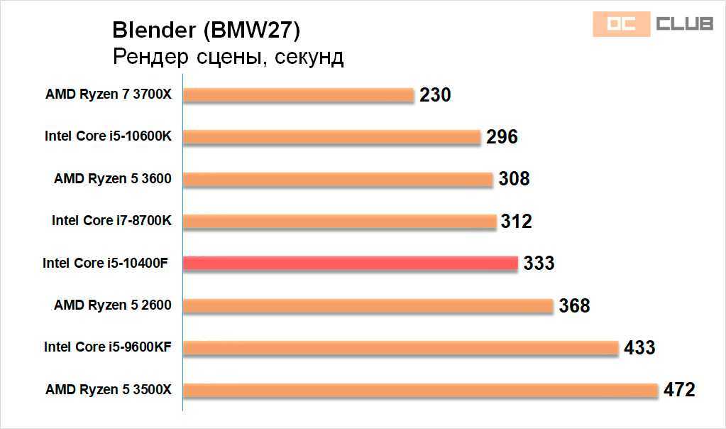 Бенчмарк Blender тоже хорошо распараллеливает нагрузку по ядрам для рендера сцены. Использовался пресет bmw27. Итоговый результат в секундах, затраченных на рендер.