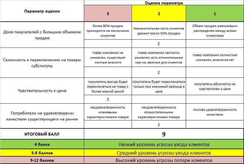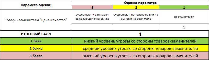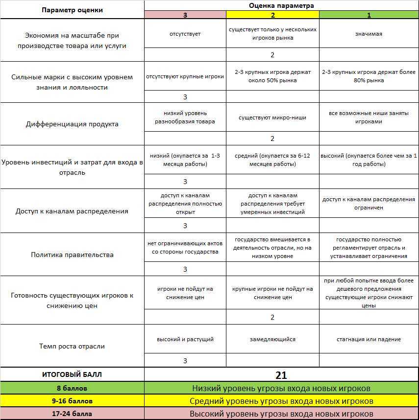 Для оценки уровня угрозы достаточно заполнить 5 таблиц данного примера. В каждой таблице приведены параметры для оценки конкуренции. Оценка параметров проводится по 3-х балльной шкале.