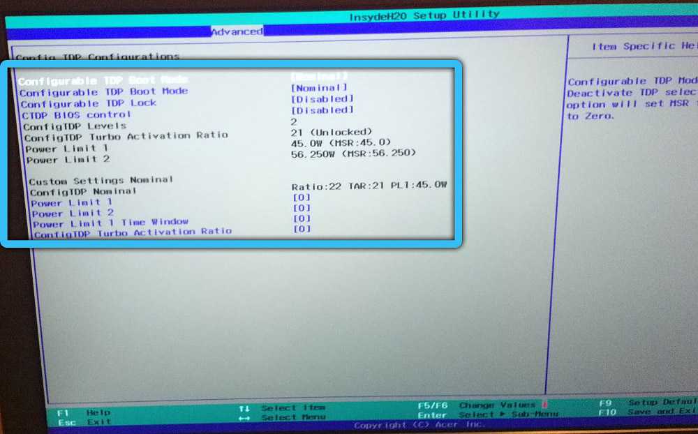 Некоторые материнские платы предлагают возможность вручную изменить лимит TDP, что не лишает процессор применения технологии автоматического разгона, а только сокращает пределы, в которых он будет выполняться. В настройках BIOS для этого потребуется найти параметр cTDP, чаще всего он располагается во вкладке Advanced (расположение опции может отличаться в зависимости от материнки). Напротив параметра меняется значение, например, при 95 Вт можно выставить 65 Вт, а при значении в 65 Вт присваивают 45 Вт или 35 Вт, после чего нужно сохранить изменения и выйти из БИОС.