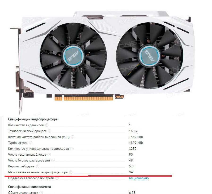 На примере видеокарточка GTX 1060 от Asus. У нее порог максимальной температуры равен 94 градуса.