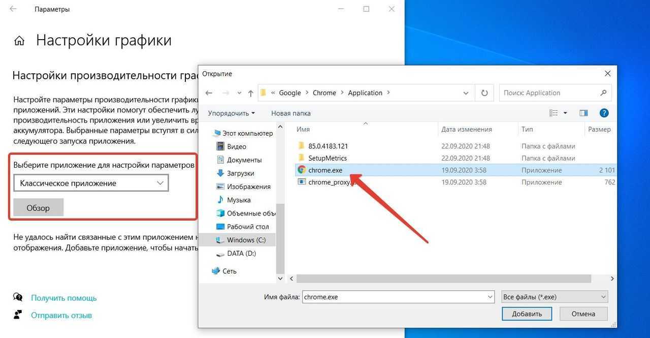 В разделе Выберите приложение для настройки параметров выберите Классическое приложение и нажмите Обзор. Затем перейдите к исполняемому файлу приложения или игры, который вы хотите принудительно запустить на нужном графическом процессоре.
