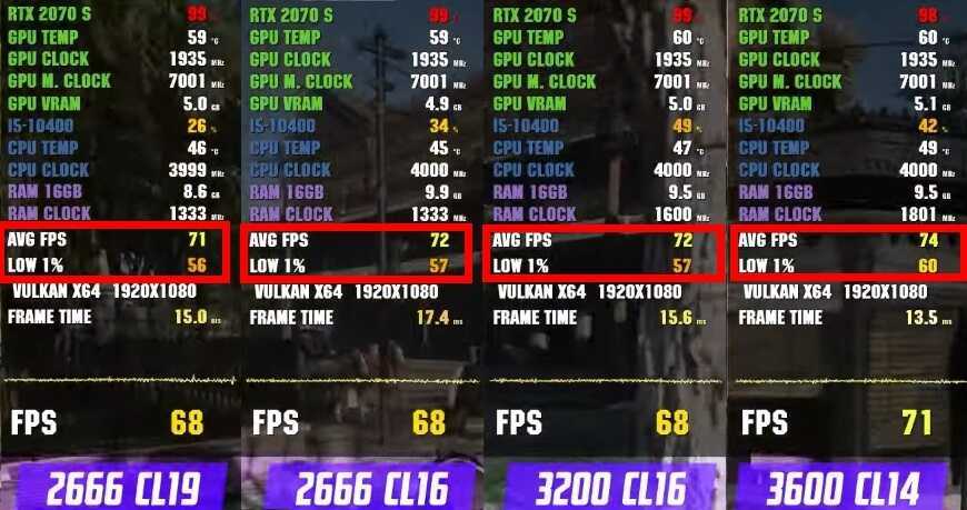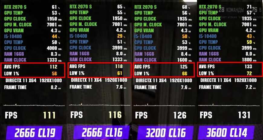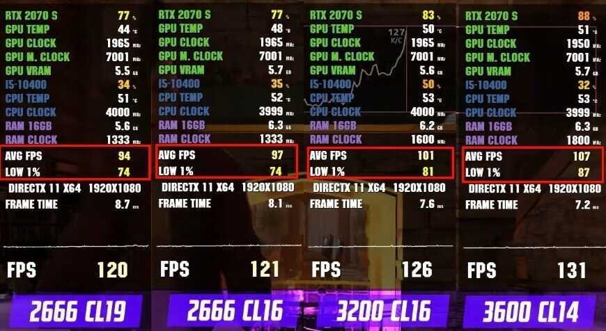 Из теста можно увидеть, что при изменении частоты оперативки на 2666 МГц CL16, можно добиться увеличения производительности на 3,92% и 2,67% (по среднему количеству кадров в секунду и минимальному количеству кадров в секунду 1% соответственно) в сравнении с самой дешёвой памятью 2666 МГц CL19.