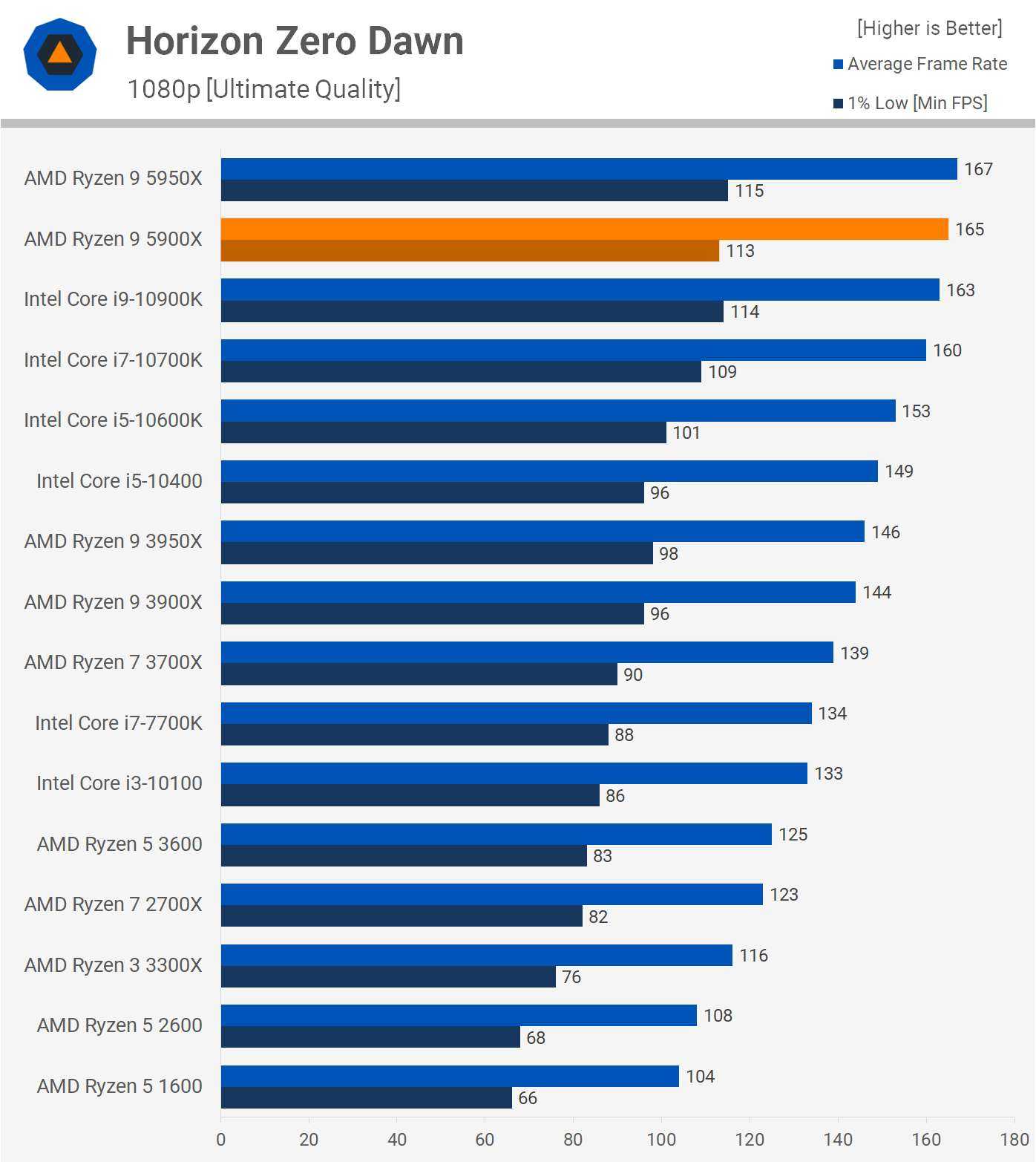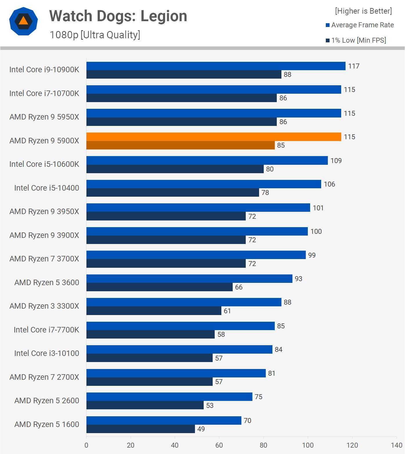 Здесь 5900X на 15% быстрее, чем 3900X, и, что очень важно, может сравниться с 10900K, обогнав его на несколько кадров при практически той же производительности