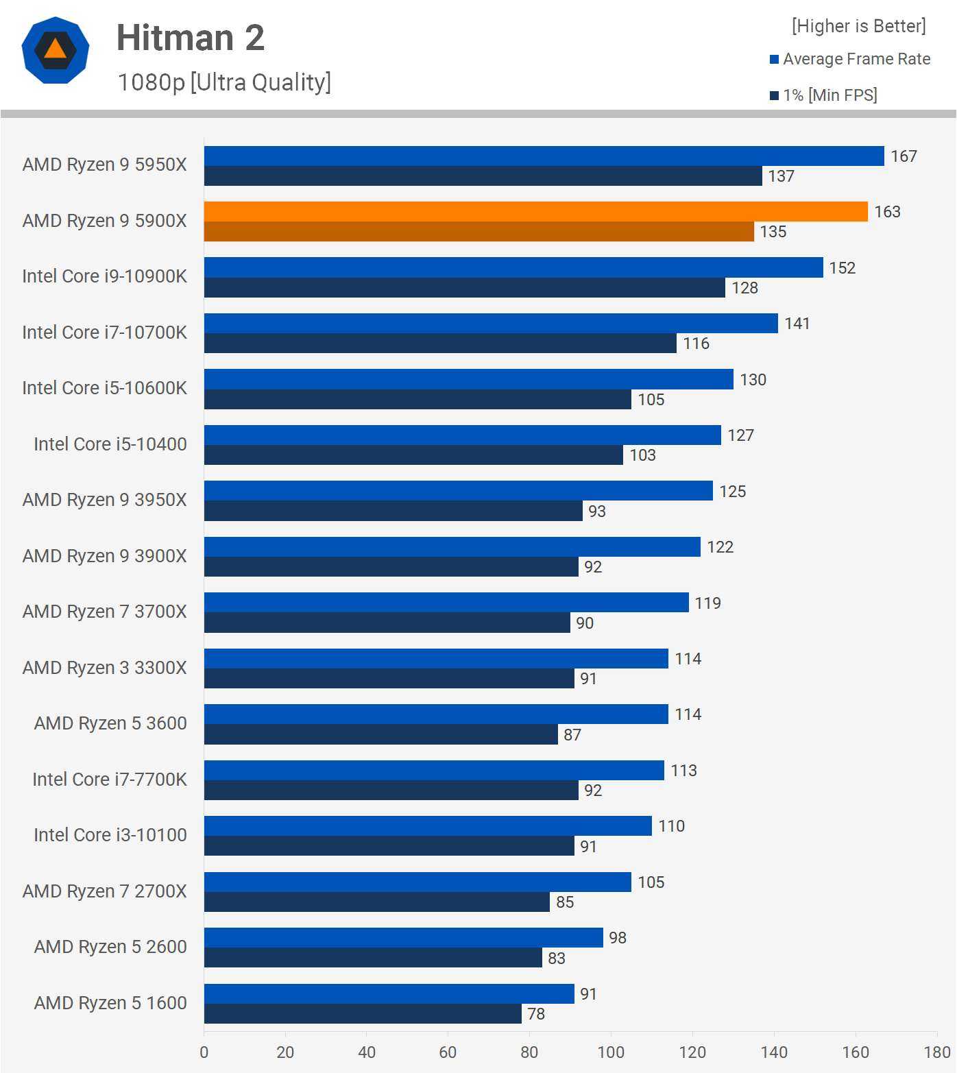 Производительность Hitman 2 также на высоте. Здесь 5900X не мог сравниться с 5950X, но все же был на 7% быстрее, чем 10900K, и на 34% быстрее, чем 3900X.