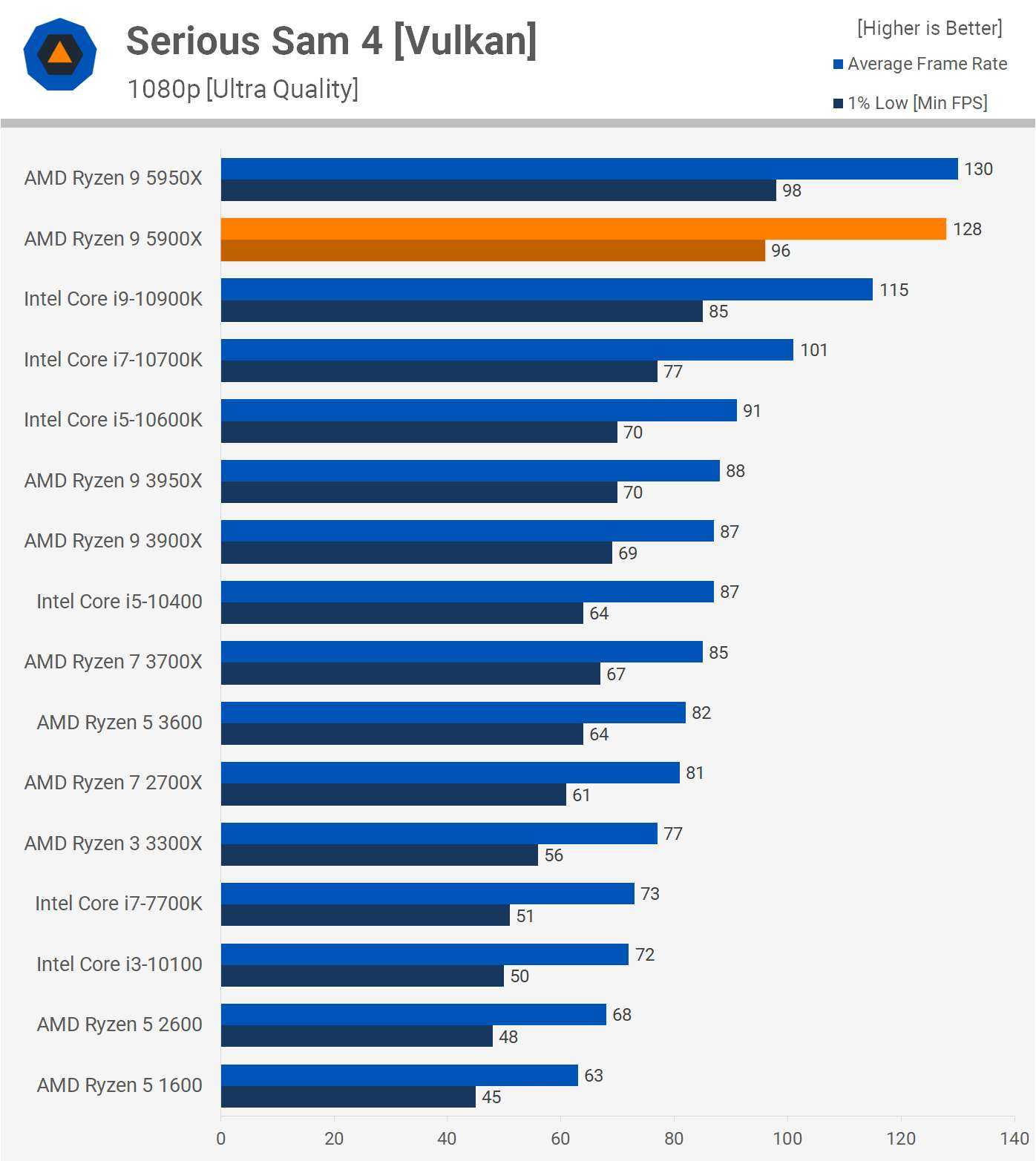 Результаты Serious Sam 4 выглядят неплохо для Ryzen. 5900X на 11% быстрее 10900K и на целых 47% быстрее, чем 3900X.