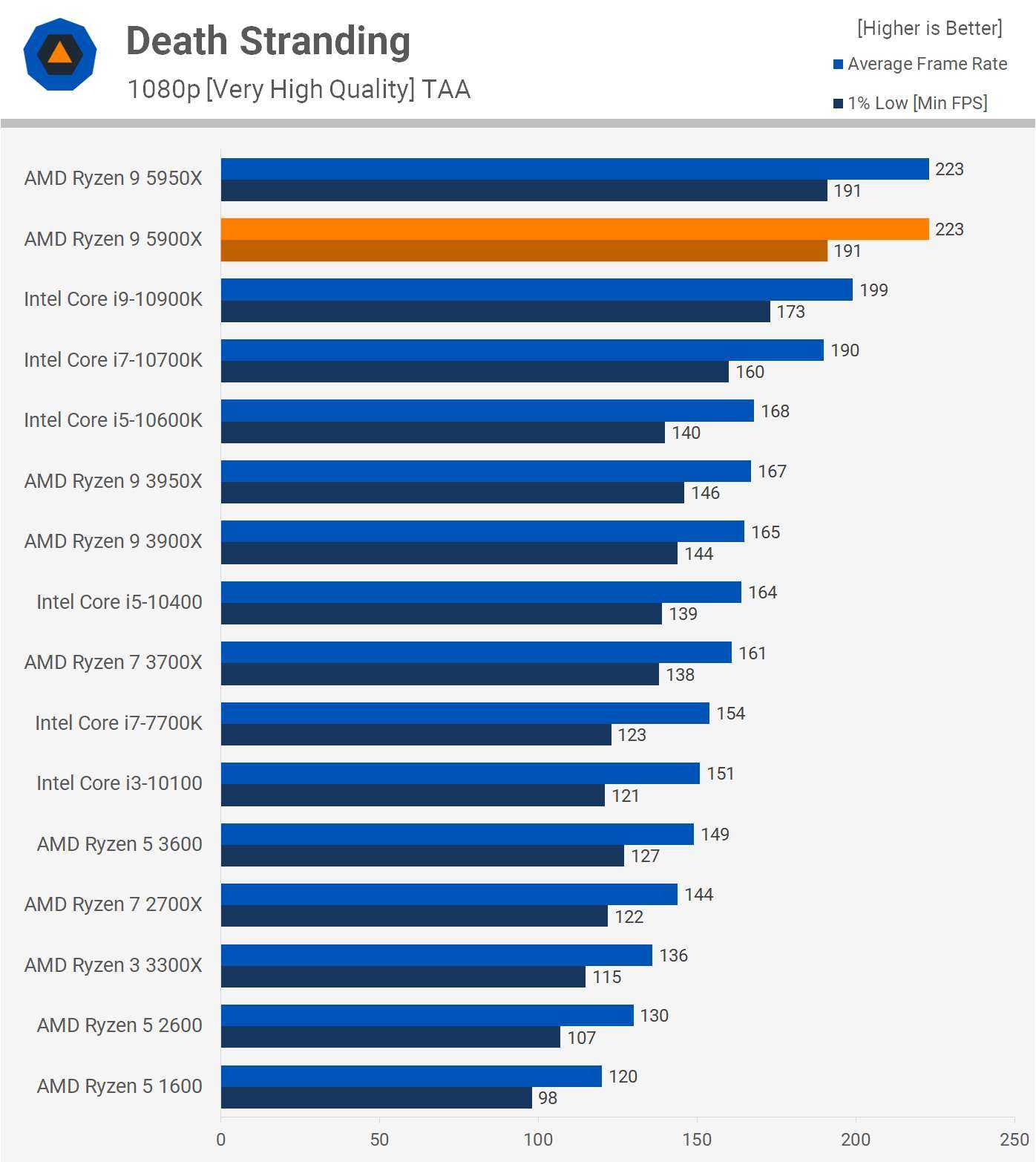 Как было замечено ранее в обзоре 5950X, эти процессоры Zen 3 — звери в Death Stranding, а 5900X точно соответствует 16-ядерной модели, что делает его на 12% быстрее, чем 10900K, и невероятно, на 35% быстрее, чем 3900X.