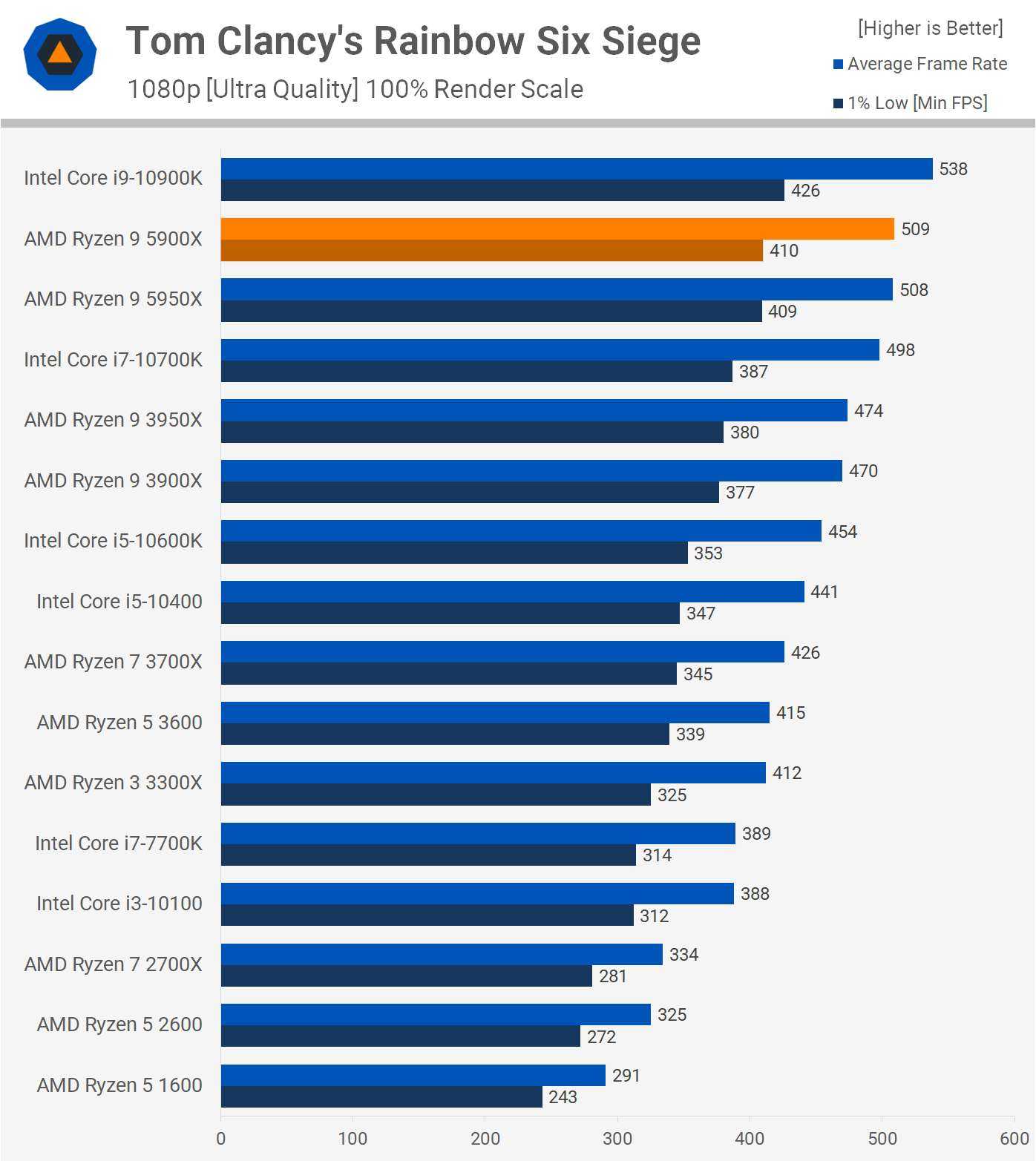5900X также отстает от 10900K в Rainbow Six Siege с небольшим отрывом в 5%. Мы видим, что процессор, соответствующий 5950X, обеспечивает на 8% прирост по сравнению с 3900X. Этого было достаточно, чтобы вытеснить некоторые процессоры Intel с меньшим количеством ядер, такие как 10700K.
