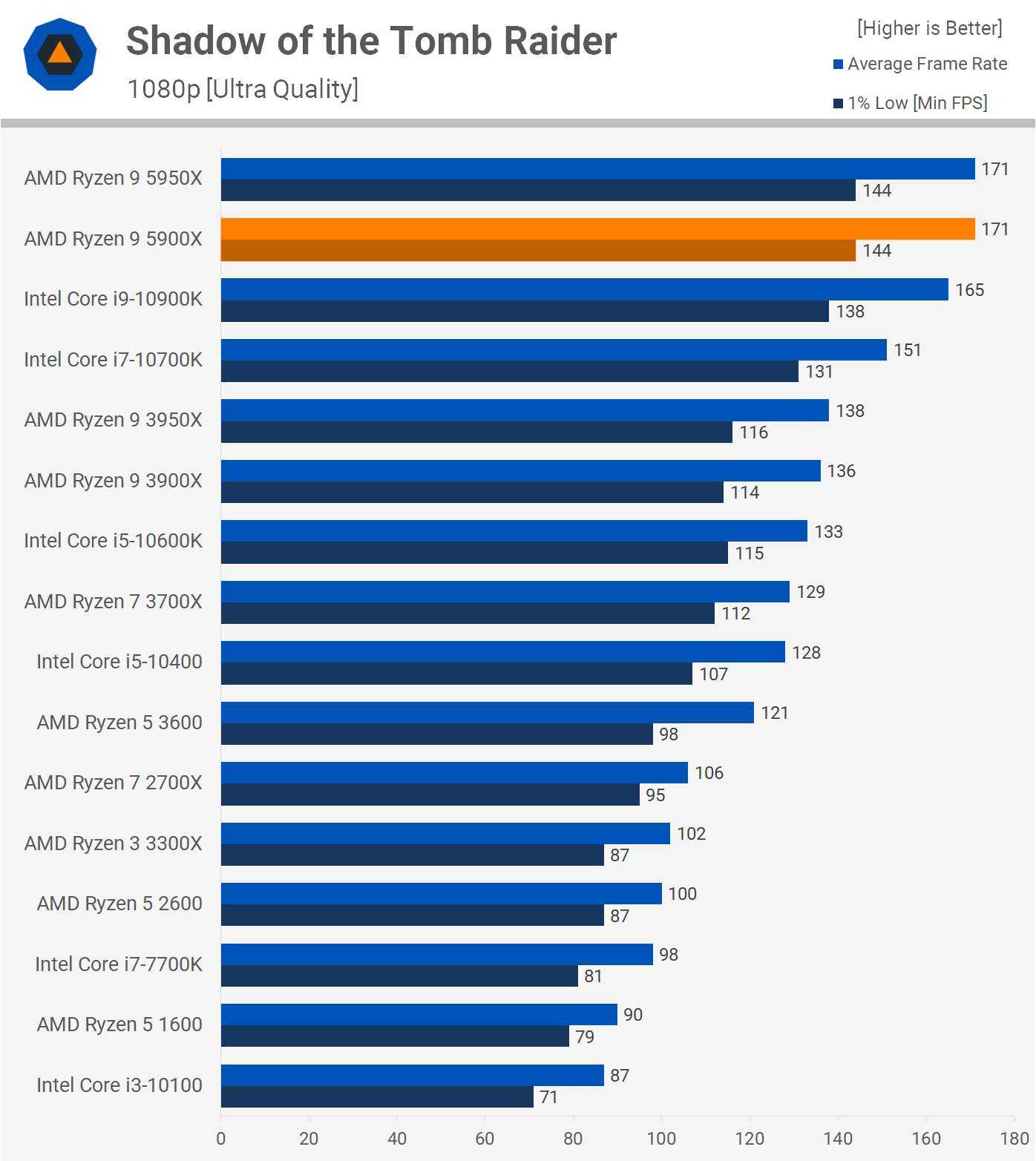 5900X также может сравниться с 5950X в Shadow of the Tomb Raider, то есть на 4% быстрее, чем 10900K. Небольшая победа, достаточная для того, чтобы считать ничью. В этом названии новый процессор превосходит старый 3900X на 26%.