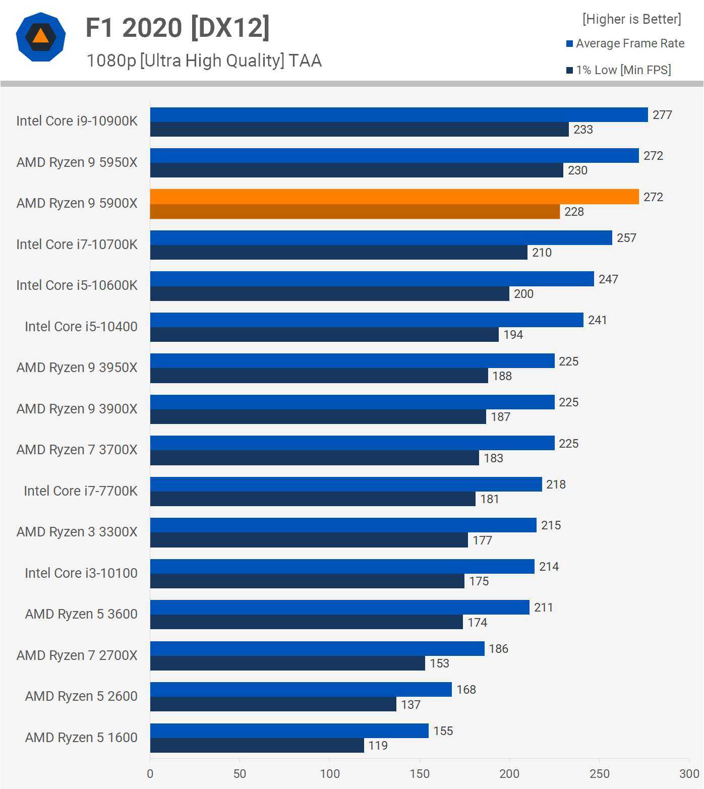 Мы также видим большой прирост производительности в F1 2020, поскольку 5900X на 21% быстрее, чем 3900X, достигая 272 кадров в секунду с RTX 3090. Это отличный результат, поскольку новый 12-ядерный процессор Ryzen всего на 2% отстает от 10900K. . Это достаточно близко, чтобы считать ничью в нашей книге.