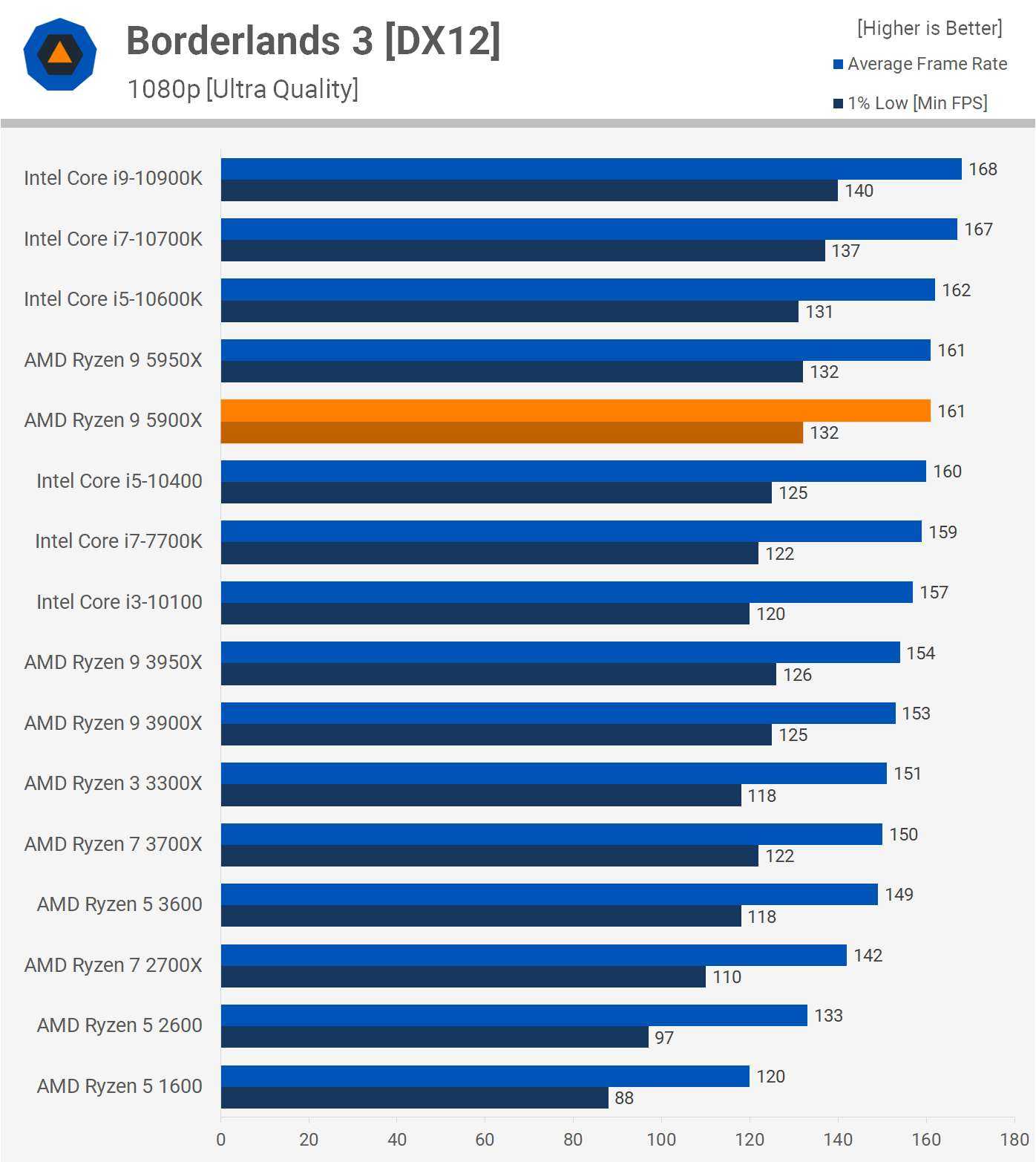 Производительность в Borderlands 3 лишь немного улучшилась. 5900X был всего на 5% быстрее, чем 3900X, хотя этого было достаточно, чтобы достичь диапазона 10900K, потеряв всего 4%.