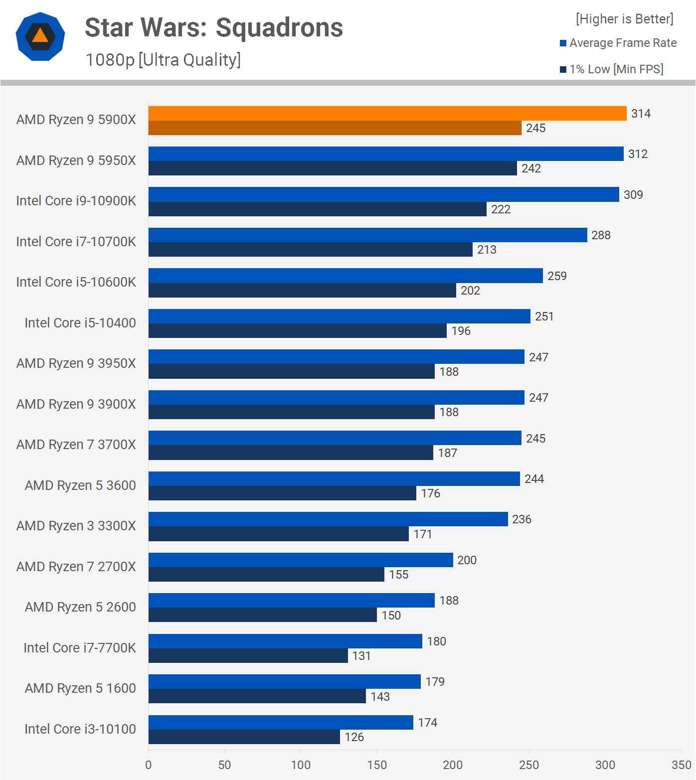 Производительность в Star Wars: Squadrons высока, соответствует 10900K, но убедительно уступает ей в 1% низкой производительности. Затем мы видим повышение производительности на 27% по сравнению с 3900X, при этом средняя частота кадров увеличилась с 247 до 314 кадров в секунду.
