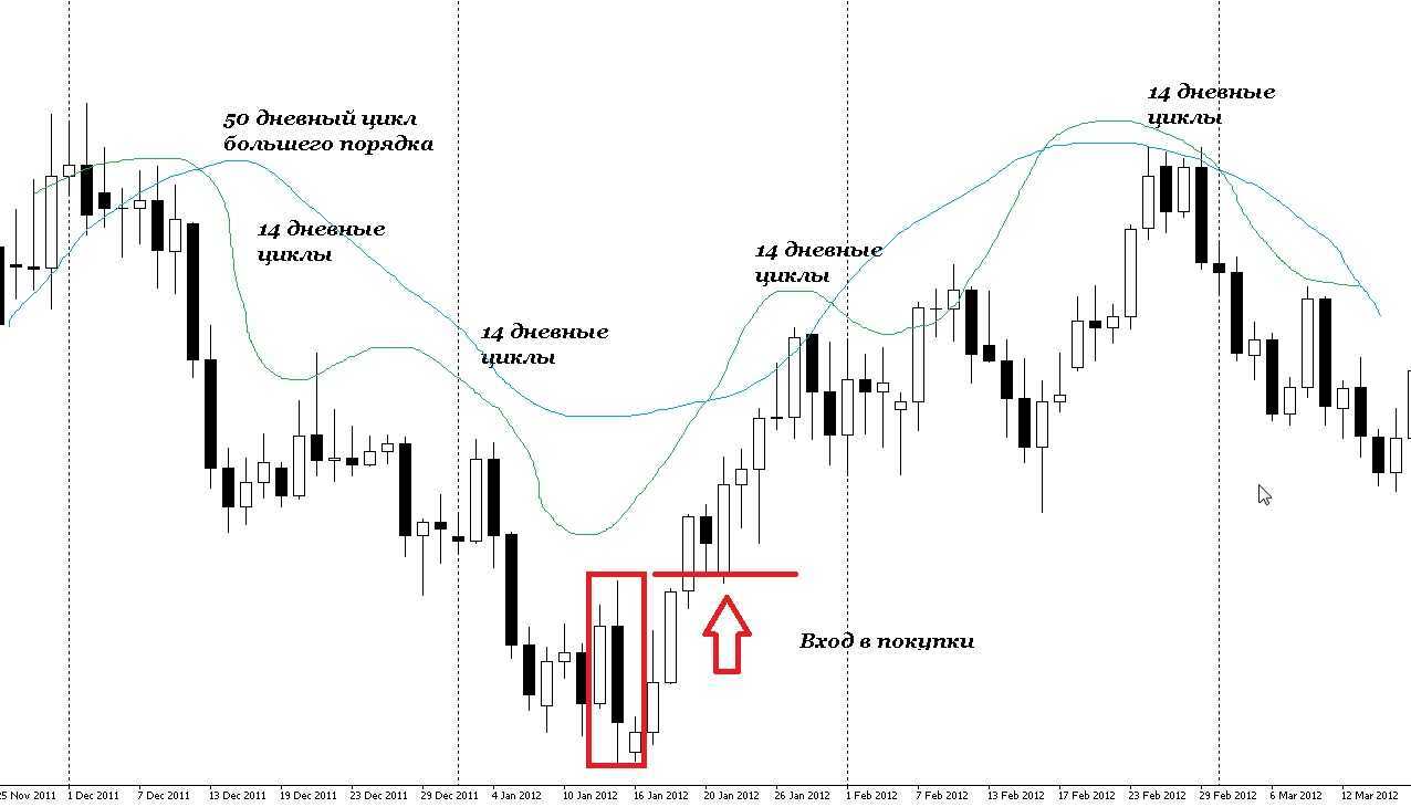 Однако после того, как цены входят во временное окно, трейдер должен прибегнуть к более традиционным техническим инструментам, которые могут подтвердить факт поворота цикла, подавая тем самым сигнал к действию. Выбор конкретных методик, позволяющих определять наиболее благоприятные моменты входа и выхода из рынка, остается за трейдером, который предпочитает полагаться на излюбленные, наиболее привычные для него инструменты.