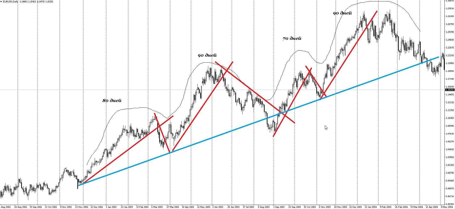 Принцип гармоничности подразумевает, что соотношение соседних волн определяется небольшим целым числом, обычно “2”. Например, следующим меньшим циклом, соседним с двадцатидневным, будет десятидневный – то есть меньший в два раза. Следующим по возрастанию будет сорокадневный, то есть больший в два раза.
